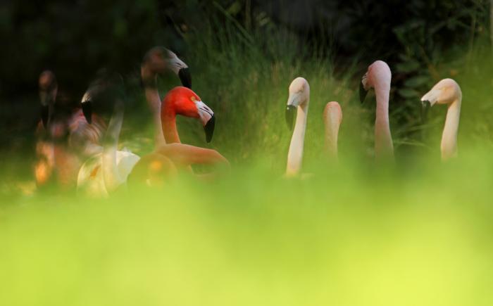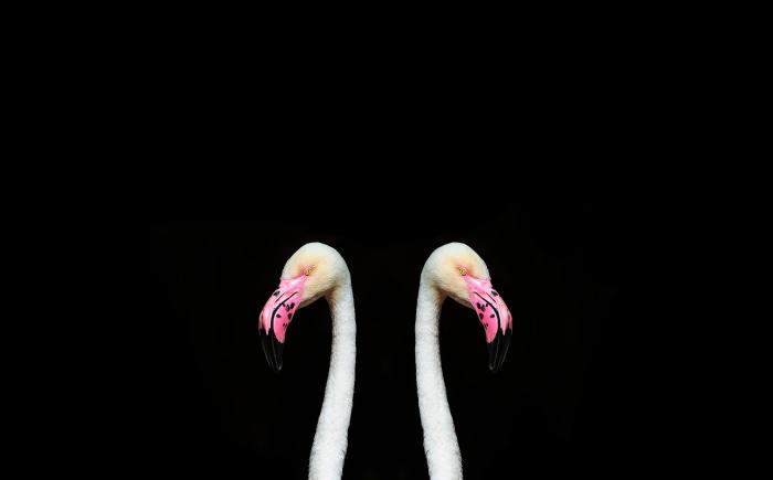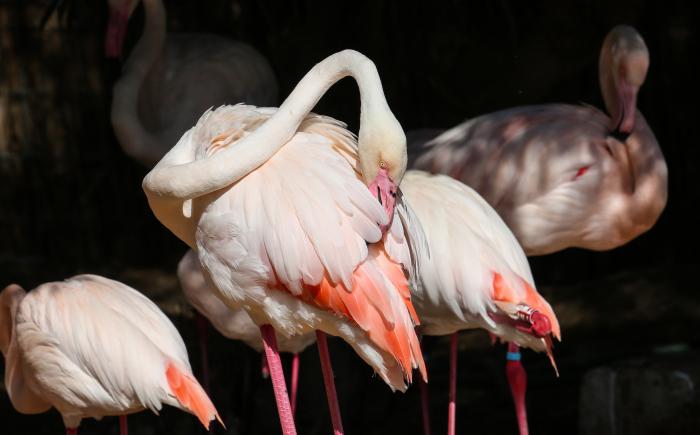 Greater Flamingos are the largest member of the flamingo family.The bill is pink with a restricted black tip, and the legs are entirely pink.