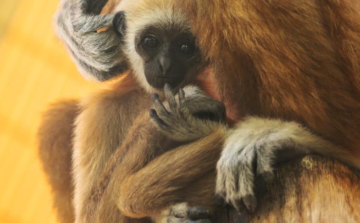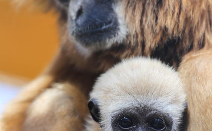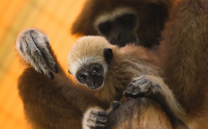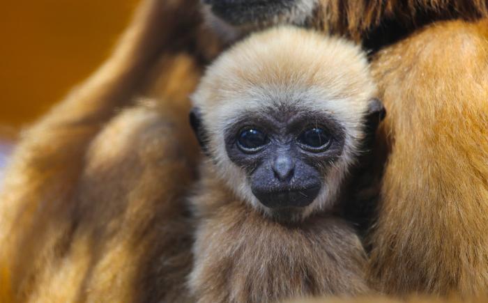 Gibbons share features with great apes: large brain, no tail, up-right posture, and broad chest.